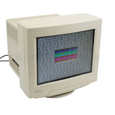 Computer CRT monitors are notoriously troublesome to film without showing annoying roll bars running up the screen due to the interaction between the CRT refresh rate & the camera frame rate. This is a typical beige CRT monitor of the 1990s which has had a modern TFT flat screen carefully grafted in to replace the troublesome, heavy, old & power hungry tube. This means that the screen can be filmed directly without genlock or roll bar issues. Screen resolution up to 1024 x 768. Plugs into a standard PC VGA port so that any computer can be used to display data screens & not just pretty pictures as shown. Can also be fed from our media players. Monitor is mounted on a ball & socket stand so the screen can be easily rotated or swivelled up/down.