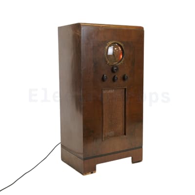 7404: Practical floor standing vintage wireless radio in wooden case with backlit tuning scale